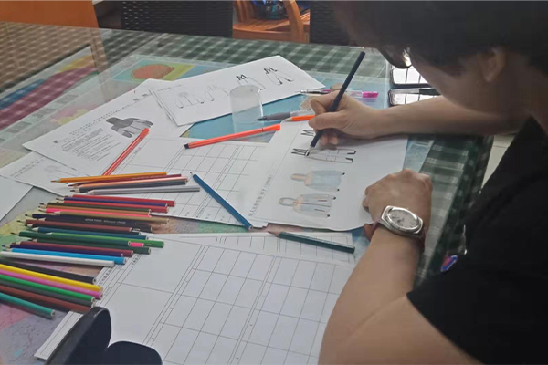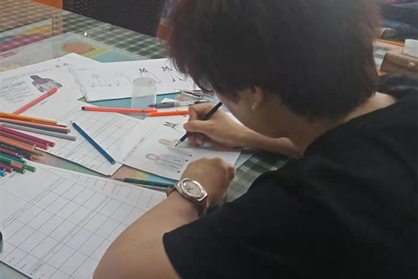 盡管困難重重,我們也要想進一切辦法做到,不僅要做好,而且要做到最好!我們的總經理自己也搖身一變設計師——畫稿,可以看到以下的圖片,認真、負責的態度,用心的為客戶所思,一筆一筆的畫好,一點點的涂好顏色;還有一個紙樣哥哥也在幫忙畫,他們兩個人在一兩天的時間內要畫好接近10個款衣服和褲子,雖然我們的時間不多,但是睿牛的小伙伴們也是很努力的去做,努力過就不曾后悔。