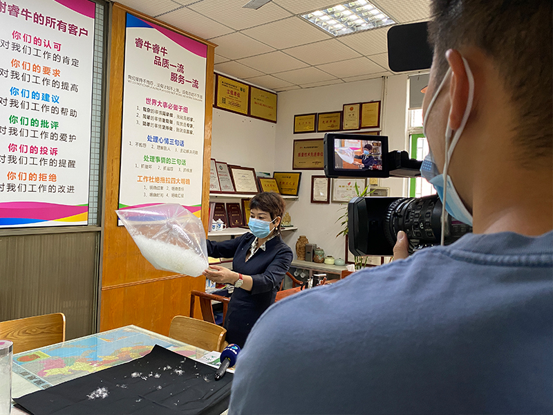媒體記者參觀了我廠車間、沖絨房,并采訪了睿??偨浝?-歐陽月華女士。