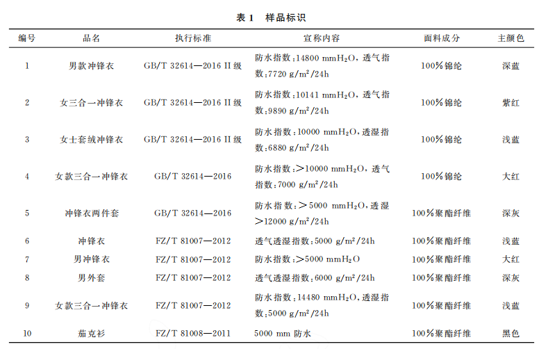分別從實(shí)體店和網(wǎng)絡(luò)平臺購買中端品牌的沖 鋒衣,不同品牌10件,價格區(qū)間在1000元左右。 其中 執(zhí) 行 標(biāo) 準(zhǔn) 標(biāo) 示 了 GB/T32614—2016 的 5 件,未標(biāo)示 GB/T32614—2016而宣稱有防水性 能和/或透濕性能的5件,詳見表1。