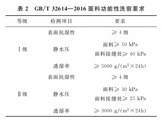 GB/T32614—2016《戶外運(yùn)動服裝 沖鋒衣》 標(biāo)準(zhǔn)依據(jù)沖鋒衣的功能指標(biāo)對其進(jìn)行了級別劃 分。I級產(chǎn)品的防水透濕要求最為嚴(yán)格,適用于 專業(yè)戶外活動;II級產(chǎn)品相對I級產(chǎn)品的防水透 濕指標(biāo)稍低,可滿足日常的戶外休閑等活動。對 于劃分I級、II級的功能性指標(biāo),應(yīng)在吊牌中標(biāo)注 “I級”或“II級”,不標(biāo)注的均視為I級產(chǎn)品。面料 功能性又分洗前和洗后要求,本文考慮了樣品成 本和比較目的達(dá)成兩方面的原因,只測試和比較 面料功能性洗前要求,見表2。