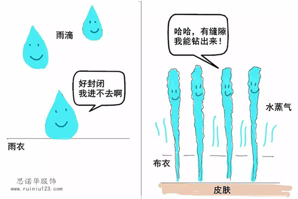 雨衣封閉,雨滴進(jìn)不去。布衣有空隙,水蒸氣能出去。
