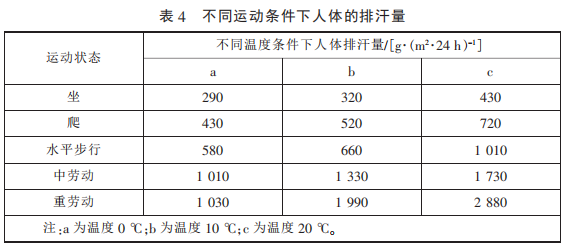 GB/T 32614—2016 中 功 能 性 指 標(洗 前)與 GB/T 21295—2014 《服裝理化性能的技術要求》對比 可知,GB/T 32614—2016 中對于拒 水、耐靜水壓和透濕率 3 項功能性 要求更高,尤其是Ⅰ類產(chǎn)品的耐靜 水壓和透濕率遠高于 GB/T 21295— 2014 的技術要求。兩標準對這 3 項 性能要求對比見 表 3。 滿 足 GB/T 32614—2016 的沖鋒衣可以抵擋暴 雨的沖擊,也滿足登山、攀巖等大 運動量下的透濕要求,不同條件下 人體的排汗量見表 4。