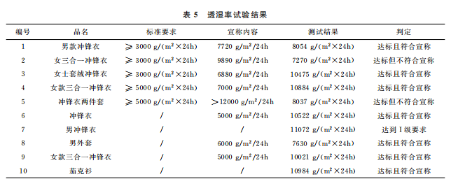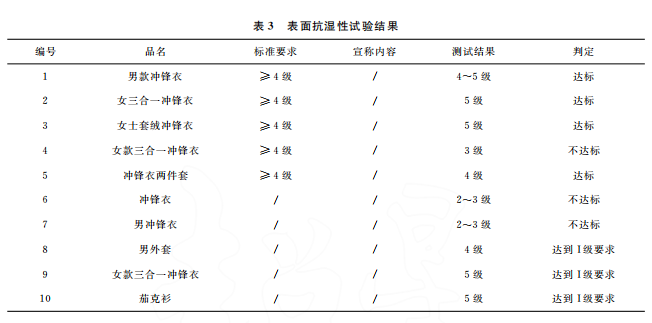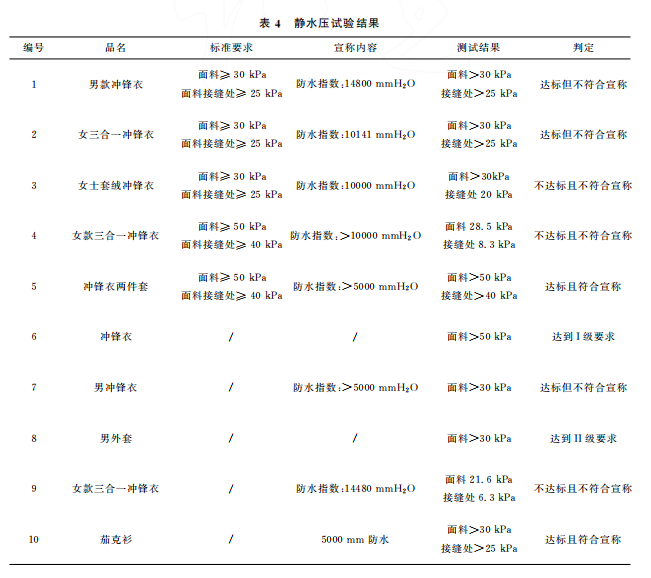本文最終的判定是結(jié)合 GB/T32614—2016《戶外運(yùn)動服裝 沖鋒衣》中面料功能性要求和產(chǎn)品銷售時的吊牌宣稱進(jìn)行。達(dá)標(biāo)是指符合沖鋒衣的合格品 標(biāo) 準(zhǔn) 要 求,反 之 則 不 符 合。10 件 樣 品中,只有5件達(dá)標(biāo),且只有3件是符合吊牌宣稱內(nèi)容。其中,標(biāo)示了 GB/T32614—2016的沖鋒衣,有3件達(dá)標(biāo),合格率為60%。近年來,監(jiān)管部門的抽查合格率一般在80%左右。這次比較試驗合格率偏低的原因可能是樣品量較少,樣品的價格區(qū)間比較集中,且考核了接縫處的靜水壓。值得注意的是有2件沒有標(biāo)示 GB/T32614—2016的外套,其性能都符合標(biāo)準(zhǔn)要求。此外,銷售方對靜水壓的宣稱都偏高,有3件達(dá)標(biāo)了卻不符合自身的宣稱內(nèi)容。沖鋒衣 GB/T32614—2016標(biāo)準(zhǔn) 中 I級 對 靜 水 壓 的 要 求 也 只是:面料≥50kPa和面料接縫處≥50kPa,銷售 方卻往往宣稱100kPa,甚至達(dá)150kPa,而且也沒有充分考慮到面料接縫處靜水壓值會相對偏小的現(xiàn)實(shí)。需要警 醒 的 是,5 件 標(biāo) 示 了 GB/T32614—2016的沖鋒衣其綜合宣傳都不符合規(guī)定,存在執(zhí)行標(biāo)準(zhǔn)標(biāo)注正確卻夸大宣傳的嫌疑。