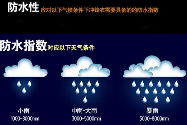 所謂防水,是指無論你是坐在潮濕的地方,抑或是身處于風雨交加的環境中,它都能夠快速而又有效地阻擋雨水和霜雪的入侵,使水無法滲透入衣服內讓你感到潮濕和寒冷;所謂透氣,是指當你進行大運動量的戶外運動時,身體自然流汗,皮膚呼出大量濕氣,如果不能在短時間內排出體外,必然會導致汗氣困在身體和衣服之間,令人感覺渾身濕透,在陰雨天氣下,更加潮濕、寒冷。