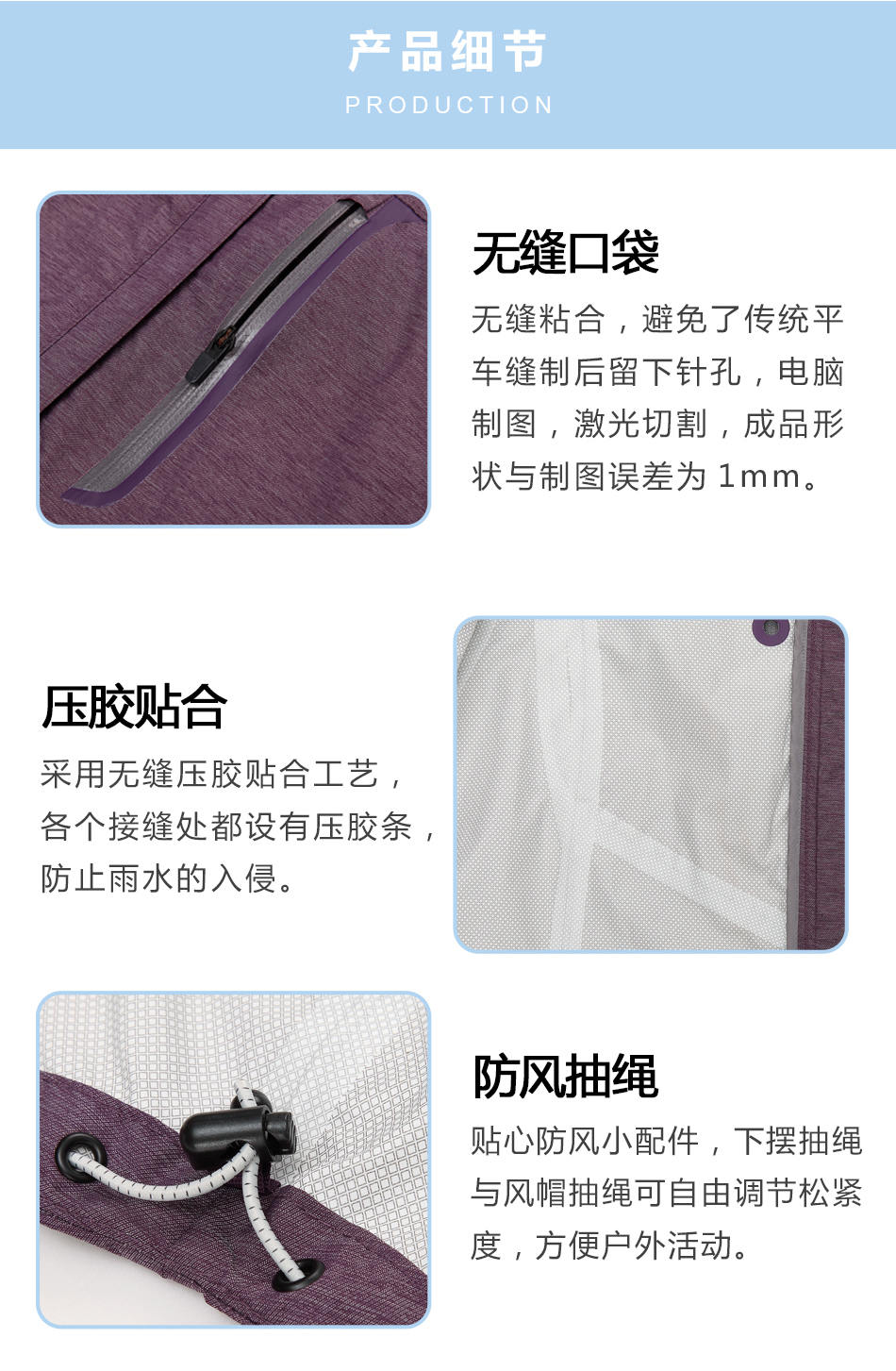 防風抽繩:貼心防風小配件,下擺抽繩與風帽抽繩可自由調(diào)節(jié)松緊度,使戶外過膠沖鋒衣更方便戶外活動。