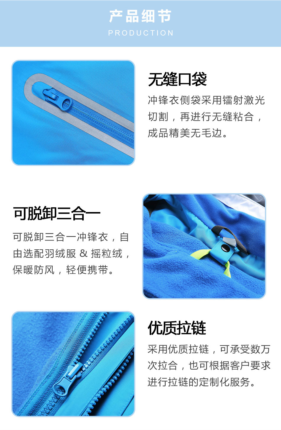 可脫卸沖鋒衣可脫卸沖鋒衣定制,自由選配羽絨服&搖粒絨,保暖防風,輕便攜帶。