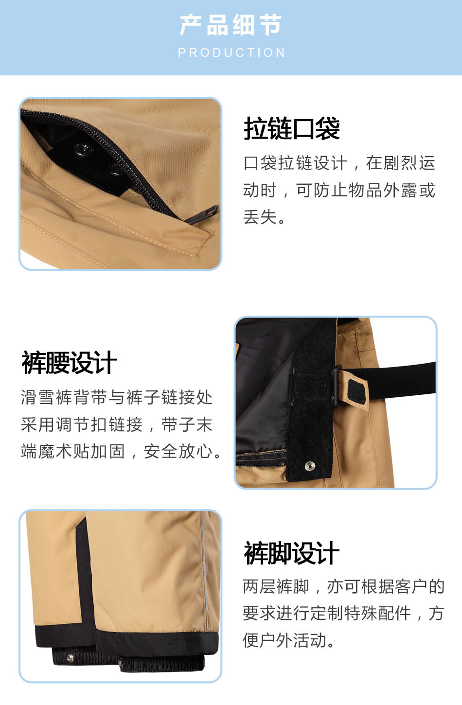 • 褲腰設計:兩層褲腳,亦可根據客戶的要求進行定制特殊配件,方便戶外活動。