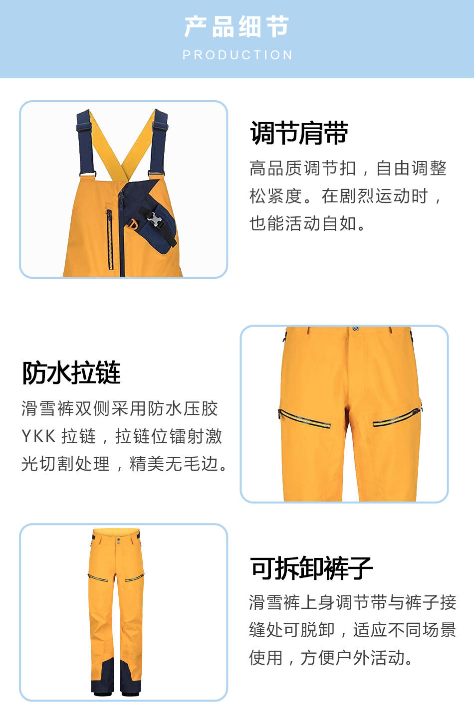 可拆卸褲子:滑雪褲上身調節帶與褲子接縫處可脫卸,適應不同場景使用,方便戶外活動。