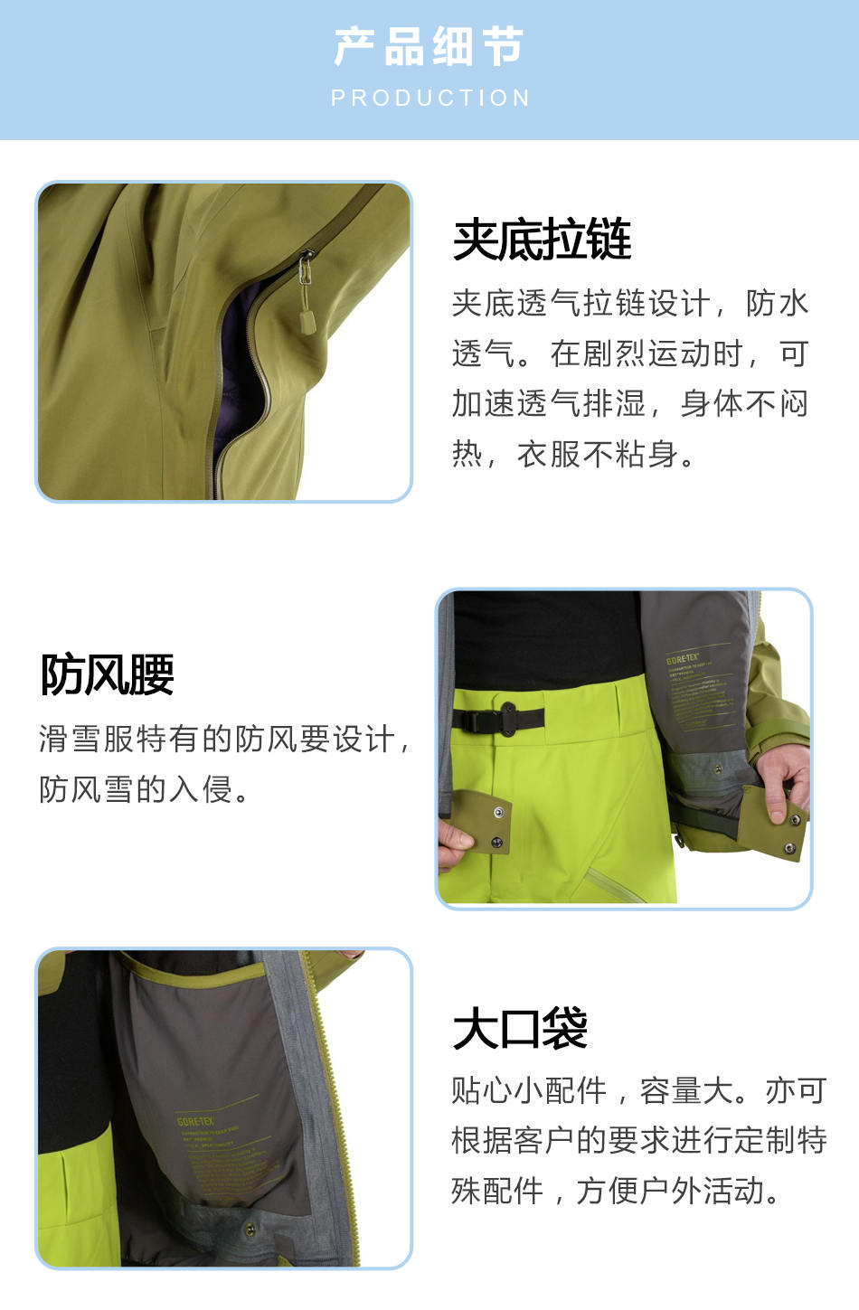• 防風腰團體滑雪服生產特有的防風腰設計,防風雪的入侵。