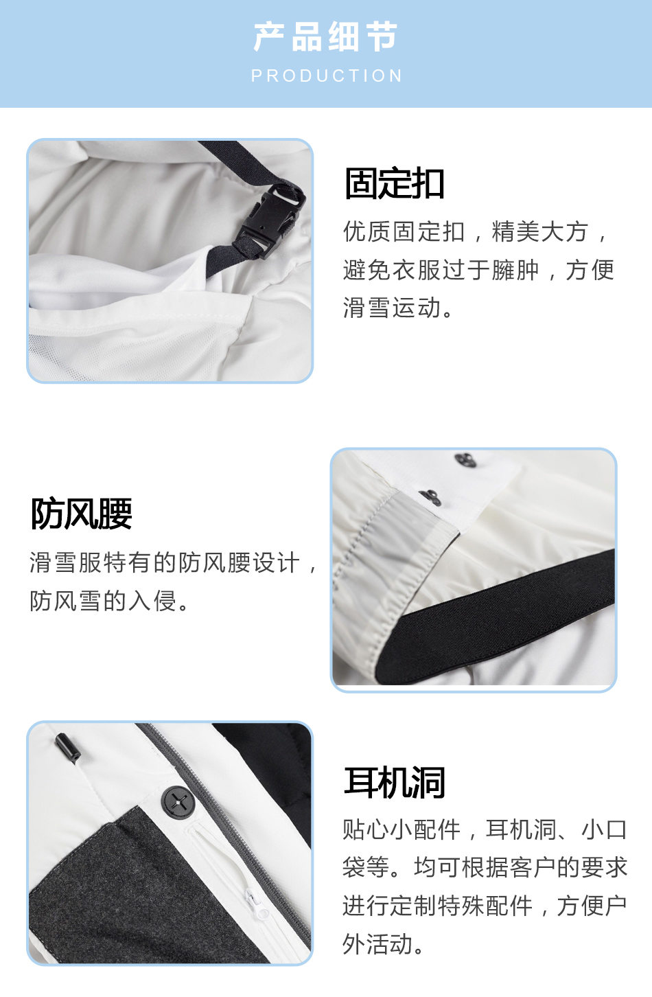 • 固定扣:優質固定扣,精美大方,避免衣服過于臃腫,方便滑雪運動。