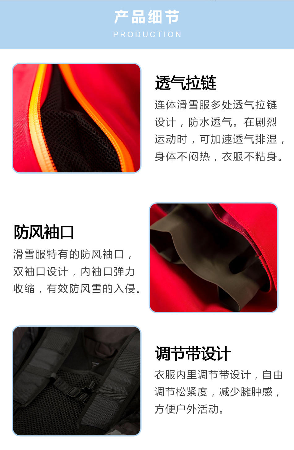 • 透氣拉鏈:連體滑雪服定制內多處透氣拉鏈設計,防水透氣。在劇烈運動時,可加速透氣排濕,身體不悶熱,衣服不粘身。